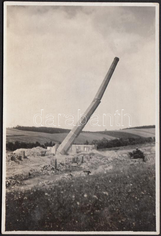 Beschreibung: cca 1930-1940 A modern magyar fényképészek egyik ismeretlen alkotójának felvétele egy megdőlt gyárkéményről, jelzés nélkül, 8x5cm