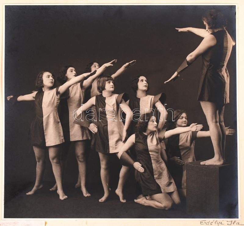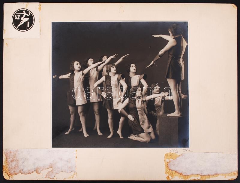 cca 1930 Erdélyi Ila: Szentpál Olga mozdulatművészeti iskolájának növendékei. Vintage fotó, aláírva, az iskola emblémájával ellátva, kartonra ragasztva, 17x18/24x32cm