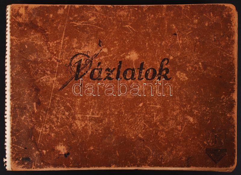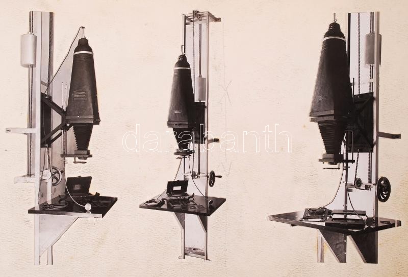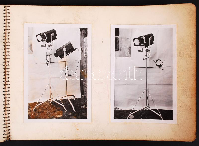 cca 1930 Házilag gyártott katalógus Burger Ferenc fotóműszerész mester fotótechnikai gépeiről (nagyítógépek, lámpák etc.), 55db fotó, ill. fotókivágás vázlatfüzetbe ragasztva