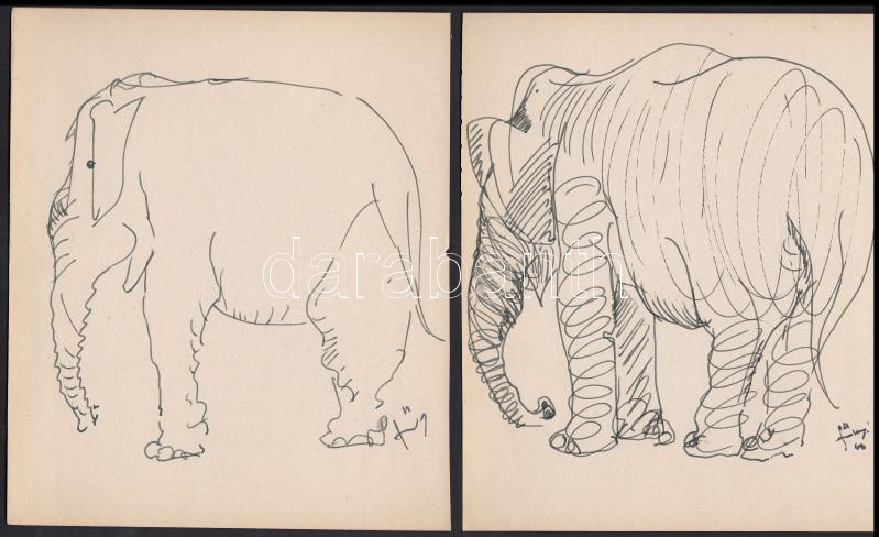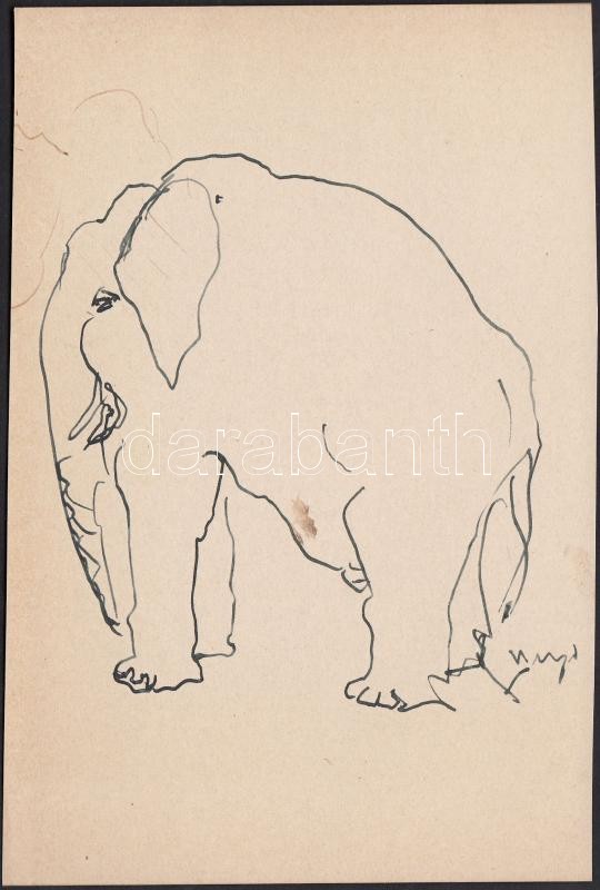 Beschreibung: Szőnyi Jenő (1902-?): 3 db vázlatrajz (elefánt), tus, papír, jelzett, 16×10 cm