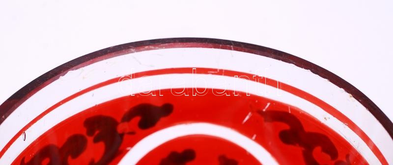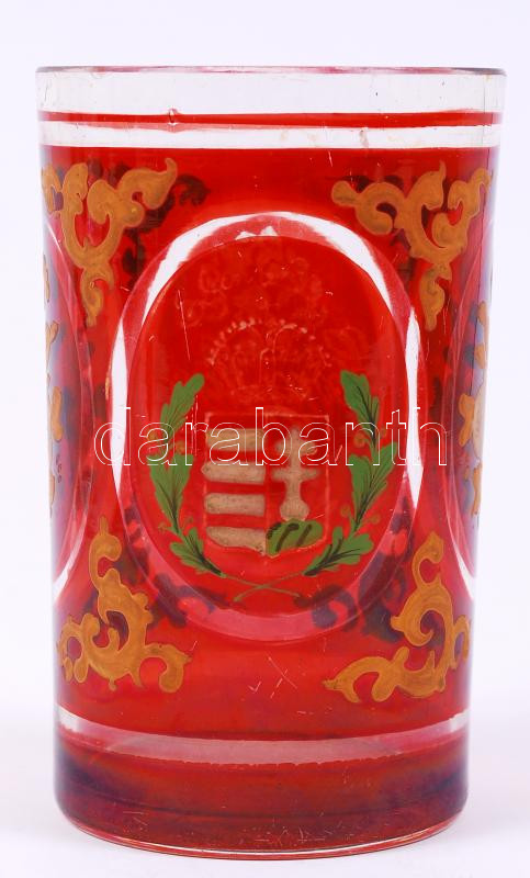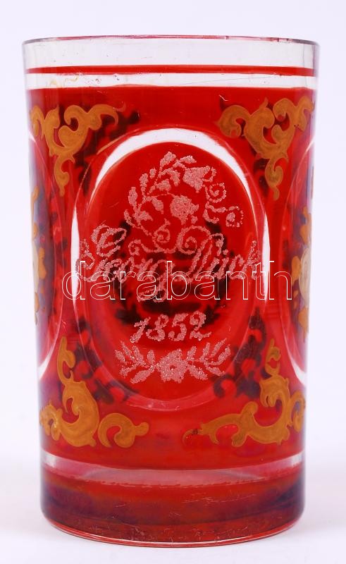 Beschreibung: Címeres emlékpohár, "Georg Dück 1852"-es felirattal, apró csorba a peremen, kézzel festett, homok fújt, m:13 cm