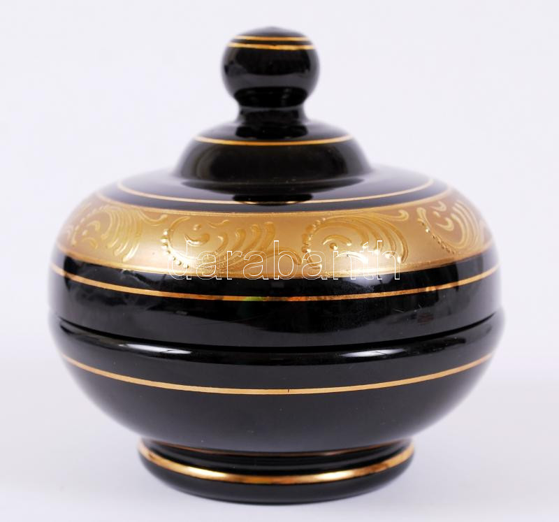 Beschreibung: Veb kunstglas, német üveg bonbonier, aranyozott díszítéssel, jelzett, d:11 cm, m:10 cm