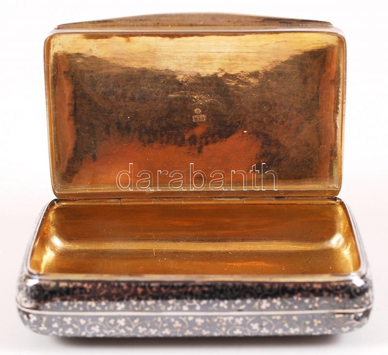 1872-1922 900/1000 tisztaságú, aranyozott belsejű, niello-díszítésű, ezüst (Ag) szelence a bécsi Markowitsch & Scheid műhelyből /