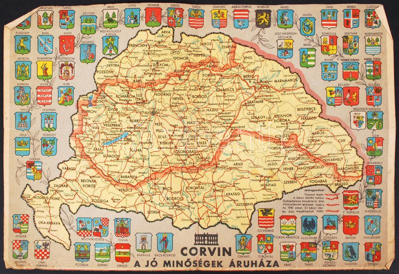 1940 Magyarország térképe Corvin áruház reklámmal és a vármegyék címer... https://www.darabanth.com/de/195-Fernauktion/195.0/Andere-Sammelgebiete/Landkarten~800025/1940-Magyarorszag-terkepe-Corvin-aruhaz-reklammal-es-a-varmegyek-cimereivel-30x20-cm~II746695