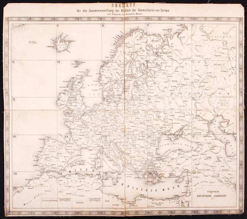 Beschreibung: Cca 1900 Skelett, für die Zusammenstellung der Blätter der Generalkarte von Europa, mit Distanzen in deutschen Meilen. Európa összegzőtérkép, 28x25 cm
