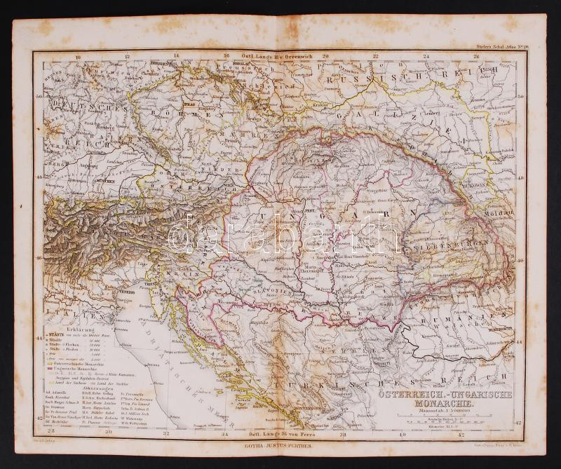 Austro-Hungarian Monarchy, colored etching, Stielers Schul-Atlas No. 20, Gotha, Justus Perthes, 24x29cm