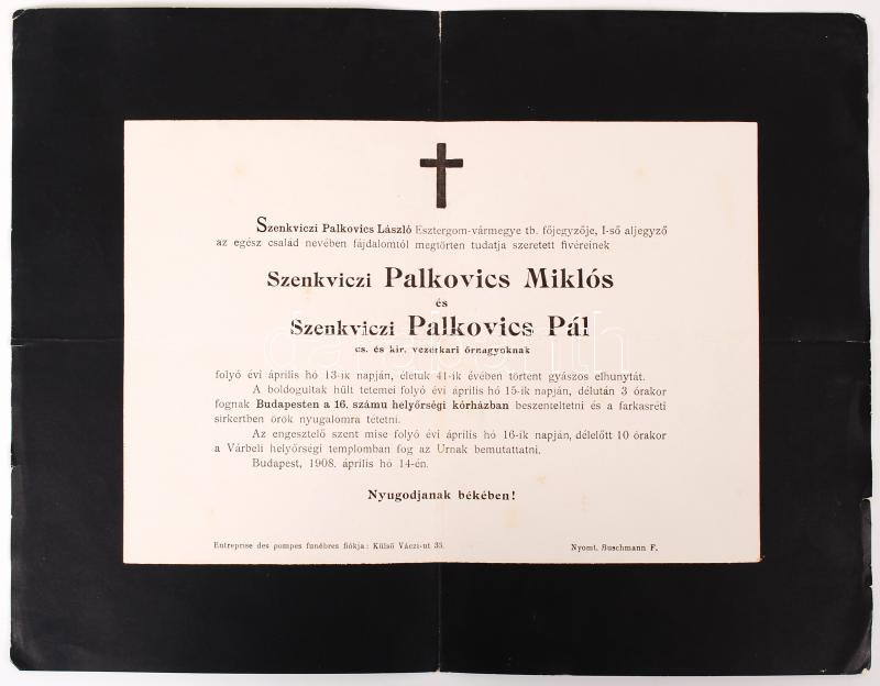 Beschreibung: 1908 Szenkviczi Palkovics Miklós és szenkviczi Palkovics Pál cs. és kir. vezérkari őrnagyok gyászjelentése