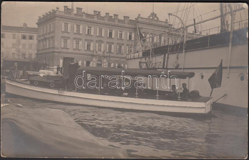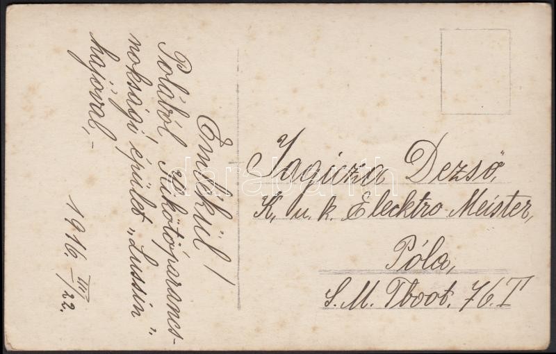 Beschreibung: 1916 Pola, kikötőparancsnokság hajókkal, fotólap, hátoldalon korabeli jegyzet