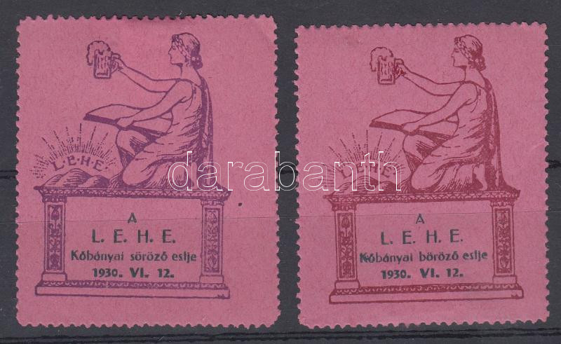 1930 LEHE söröző és "böröző" estje 2 db levélzáró https://www.darabanth.com/de/195-Fernauktion/195.0/Andere-Sammelgebiete/Paraphilatelie~800012/1930-LEHE-sorozo-es-borozo-estje-2-db-levelzaro~II749562