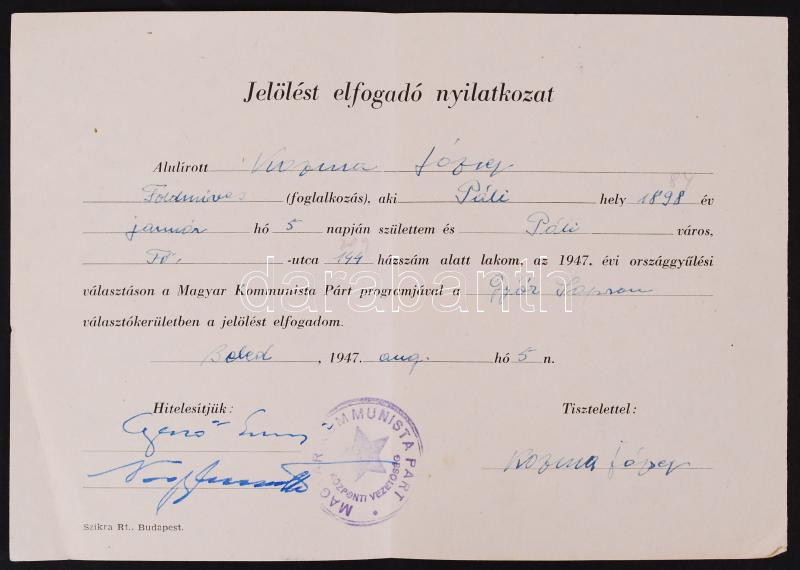 Beschreibung: 1947 A Magyar Kommunista párt jelölést elfogadó nyilatkozata Gerő Ernő és Nagy Ferenc saját kezű aláírásával
