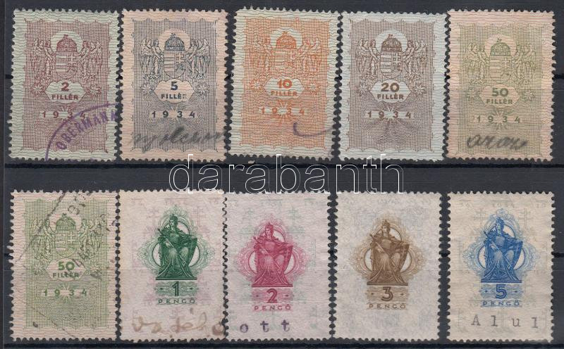 1934 10 db klf okmánybélyeg https://www.darabanth.com/de/195-Fernauktion/195.0/Andere-Sammelgebiete/Stempelmarken~800013/1934-10-db-klf-okmanybelyeg~II748934