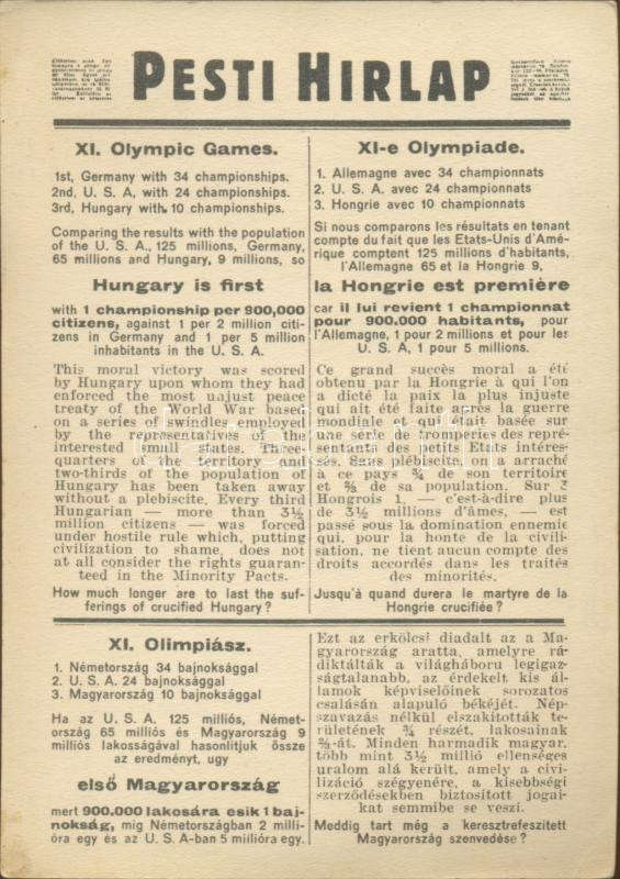 Beschreibung: Justice for Hungary, Pesti Hírlap, Olympic Games victories, irredenta (EK)