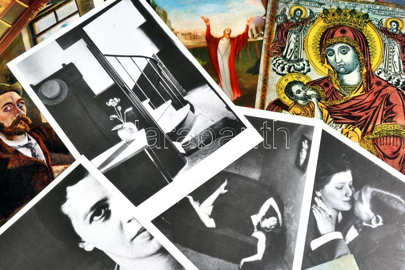132 db modern képeslap: 56 db művészeti lap, festményreprodukciók és 15 André Kertész fotóreprodukció, valamint 61 db üdvözlőlap / 132 modern postcards: 56 artistic postcards, painting and André Kertész photo reproductions, 61 greeting cards