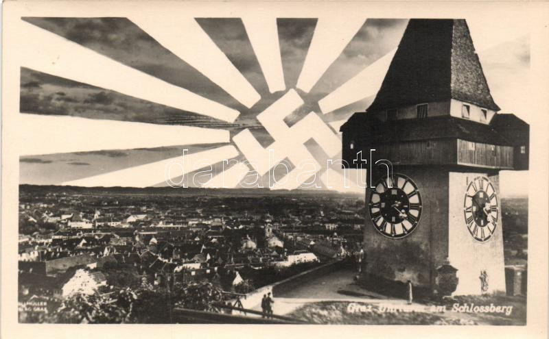 Graz, Schlossberg, Clock Tower, swastika https://www.darabanth.com/de/195-Fernauktion/195.0/Ansichtskarten/Osterreich~800045/Graz-Schlossberg-Clock-Tower-swastika~II747659