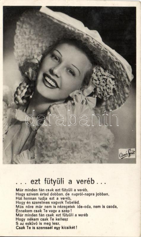Csikós Rózsi '...ezt fütyüli a veréb...' https://www.darabanth.com/de/195-Fernauktion/195.0/Ansichtskarten/Schauspielerin~800122/Csikos-Rozsi-ezt-futyuli-a-vereb~II743786