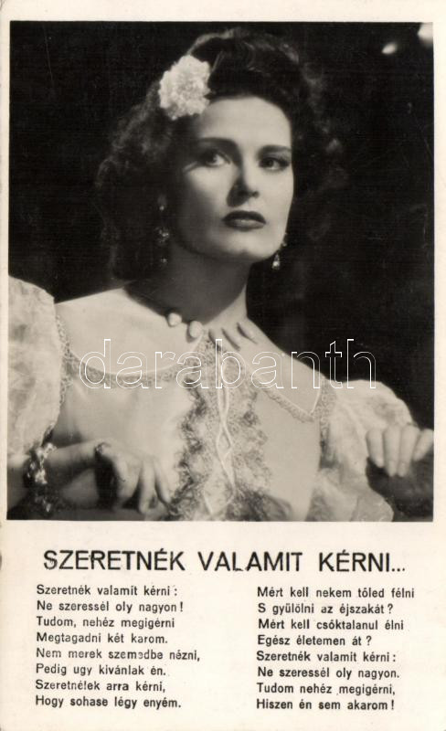 Karády Katalin, 'Szeretnék valamit kérni...' https://www.darabanth.com/de/195-Fernauktion/195.0/Ansichtskarten/Schauspielerin~800122/Karady-Katalin-Szeretnek-valamit-kerni~II743785