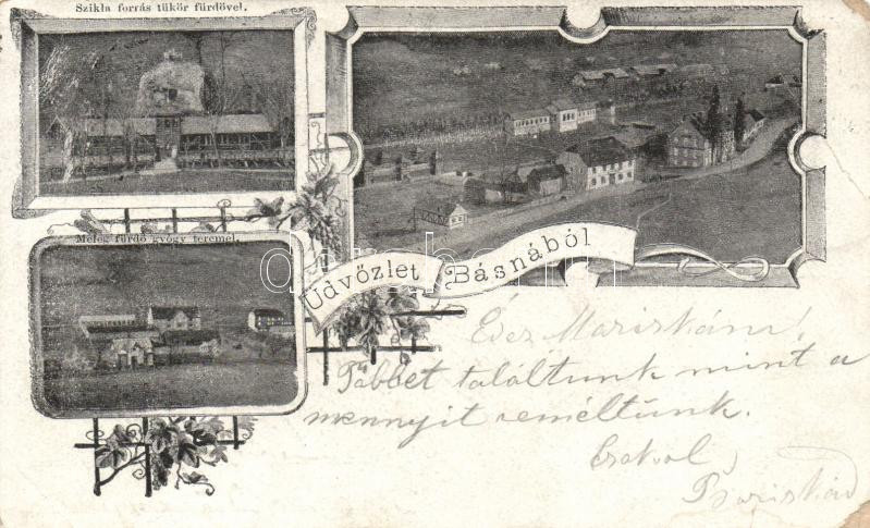 Beschreibung: Bázna szikla forrás tükörfürdővel, meleg fürdő gyógyteremmel / stone source, mirror spa, sanatorium, floral (fa)
