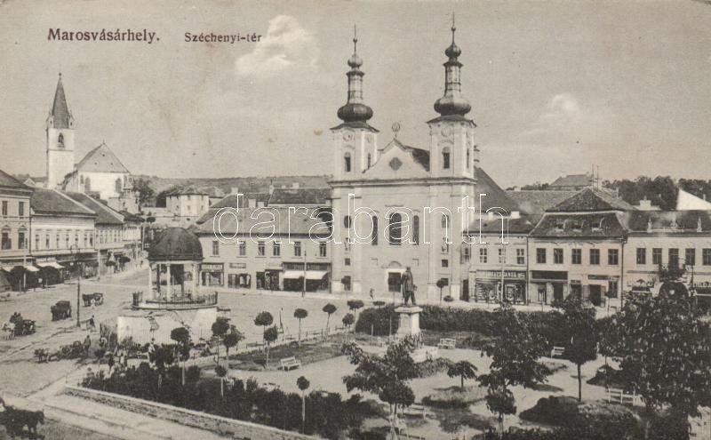 Beschreibung: Marosvásárhely, Széchenyi tér, Császár József, Siky Emil, Schuster Ödön, Lukács János üzletei / square, shops, statue