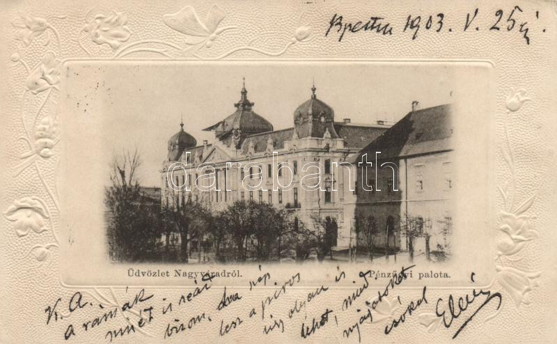 Nagyvárad, Pénzügyi Palota / palace of finance Emb. floral frame https://www.darabanth.com/de/195-Fernauktion/195.0/Ansichtskarten/Siebenburgen~600008/Nagyvarad-Penzugyi-Palota-palace-of-finance-Emb-floral-frame~II746120