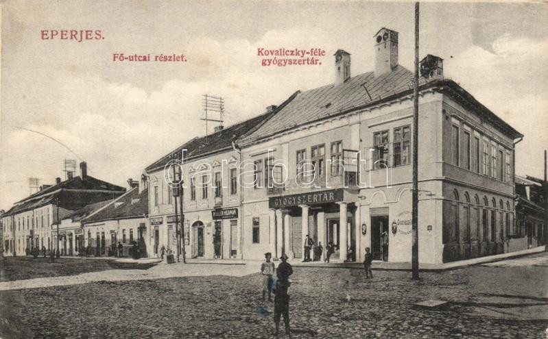 Eperjes, Fő utca, Kovaliczky-féle gyógyszertár, Müller Herman, Bakay F... https://www.darabanth.com/de/195-Fernauktion/195.0/Ansichtskarten/Slowakei~600009/Eperjes-Fo-utca-Kovaliczky-fele-gyogyszertar-Muller-Herman-Bakay-Ferenc-es-Paszternak-Man~II744122