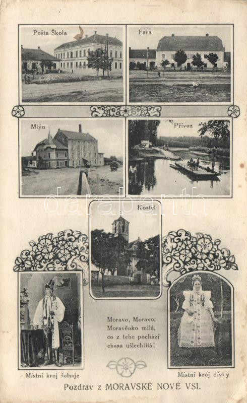 Moravská Nová Ves posta, skola, fara, mlyn, prívoz, kostel / post office, school, parsonage, mill, ferry, chapel, folklore, floral (EK)