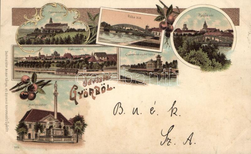 1897 Győr Püspök vár, Csolnakázó Egylet háza, Mária szobor, Rába híd, ... https://www.darabanth.com/de/195-Fernauktion/195.0/Ansichtskarten/Ungarn~600007/1897-Gyor-Puspok-var-Csolnakazo-Egylet-haza-Maria-szobor-Raba-hid-Pannonhalma-litho-f~II749841
