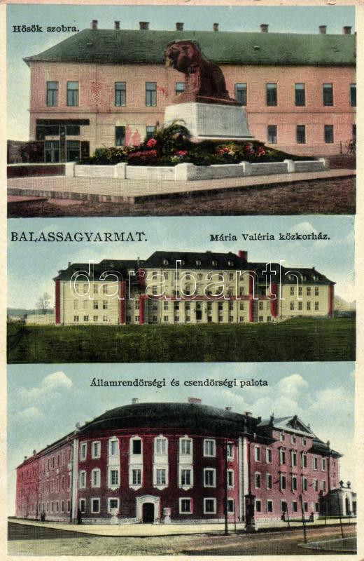 Beschreibung: Balassagyarmat Hősök szobra, Mária Valéria kórház, Államrendőrségi és csendőrségi palota