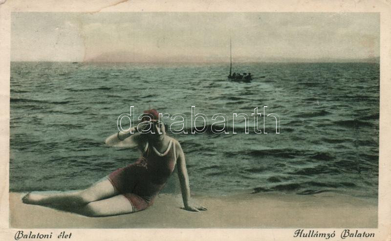 Balatoni élet, 'Hullámzó Balaton' (fl) https://www.darabanth.com/de/195-Fernauktion/195.0/Ansichtskarten/Ungarn~600007/Balatoni-elet-Hullamzo-Balaton-fl~II746619