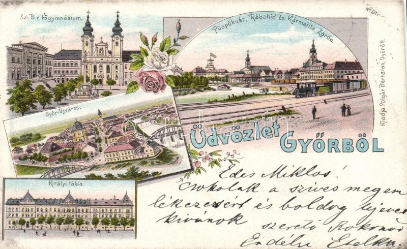 Beschreibung: Győr Püspök vár, Karmelita zárda, Rába híd, főgimnázium, Királyi tábla, Újváros zsinagóga, litho (cut)
