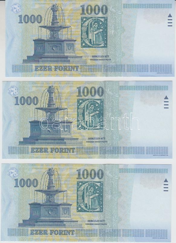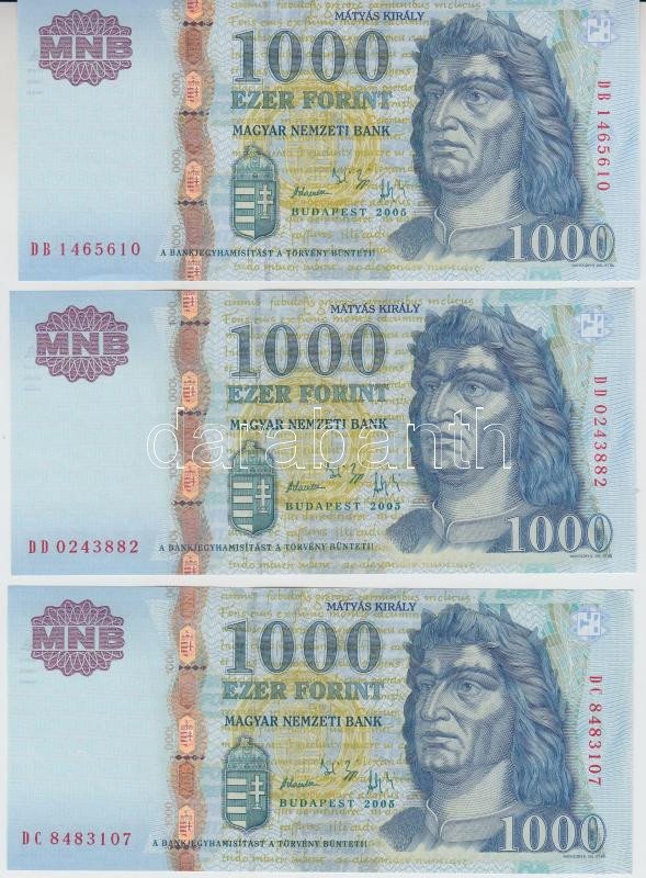 2005. 1000Ft (3x) "DB/DC/DD" T:I https://www.darabanth.com/de/195-Fernauktion/195.0/Numismatik/Ungarische-Banknoten~400009/2005-1000Ft-3x-DBDCDD-TI~II749665