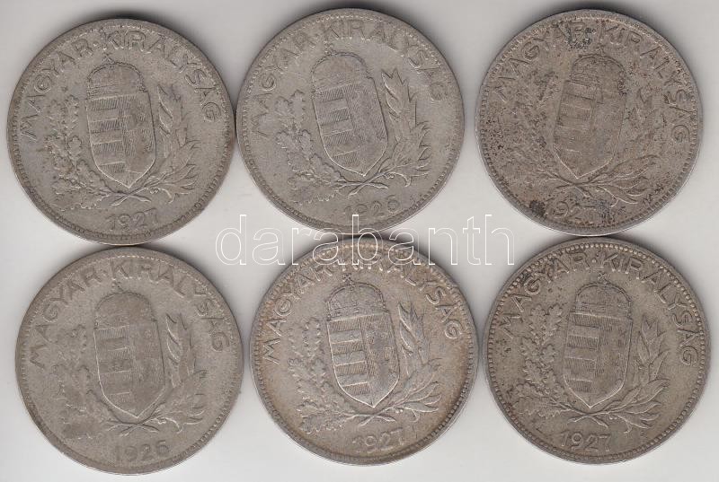 1926-1927. 1P Ag (6x) T:2-,3 https://www.darabanth.com/de/195-Fernauktion/195.0/Numismatik/Ungarische-Munzen~400007/1926-1927-1P-Ag-6x-T2-3~II743794