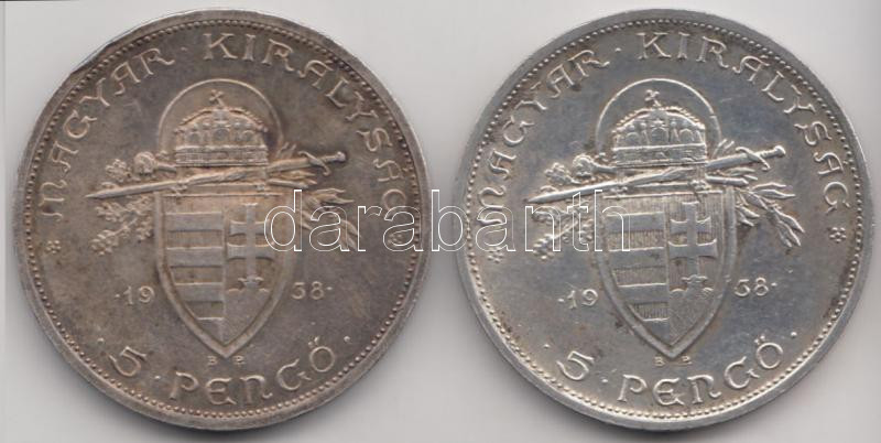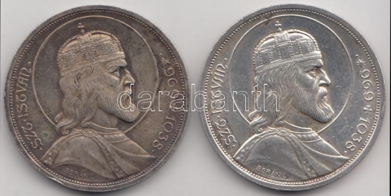 1938. 5P Ag "Szent István" (2x) T:2 https://www.darabanth.com/de/195-Fernauktion/195.0/Numismatik/Ungarische-Munzen~400007/1938-5P-Ag-Szent-Istvan-2x-T2~II747760