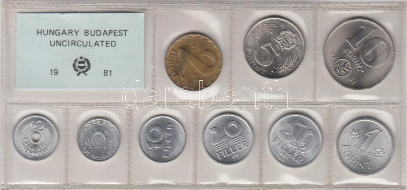 1981. 2f-10Ft 9db klf érmés forgalmi sor fóliatokban T:1 https://www.darabanth.com/de/195-Fernauktion/195.0/Numismatik/Ungarische-Munzen~400007/1981-2f-10Ft-9db-klf-ermes-forgalmi-sor-foliatokban-T1~II747239