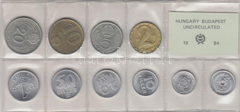 1984. 2f-20Ft 10db klf érmés forgalmi sor fóliatokban T:1 https://www.darabanth.com/de/195-Fernauktion/195.0/Numismatik/Ungarische-Munzen~400007/1984-2f-20Ft-10db-klf-ermes-forgalmi-sor-foliatokban-T1~II747240