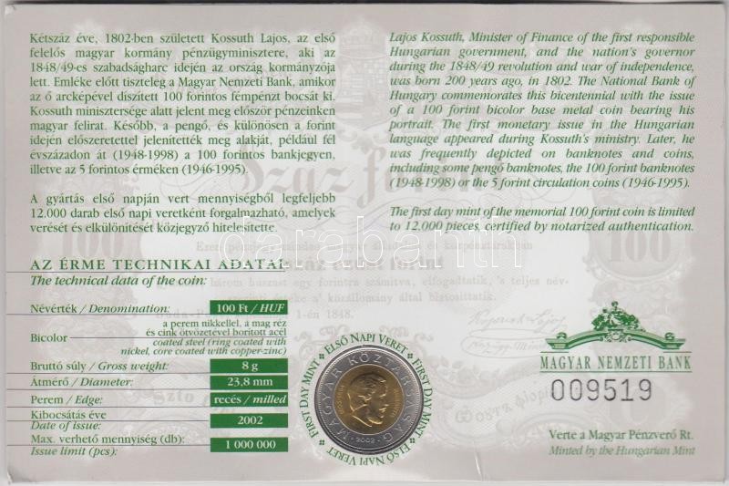 2002. 100Ft "Kossuth" elsőnapi veret sorszámozott díszlapon T:BU https://www.darabanth.com/de/195-Fernauktion/195.0/Numismatik/Ungarische-Munzen~400007/2002-100Ft-Kossuth-elsonapi-veret-sorszamozott-diszlapon-TBU~II747157