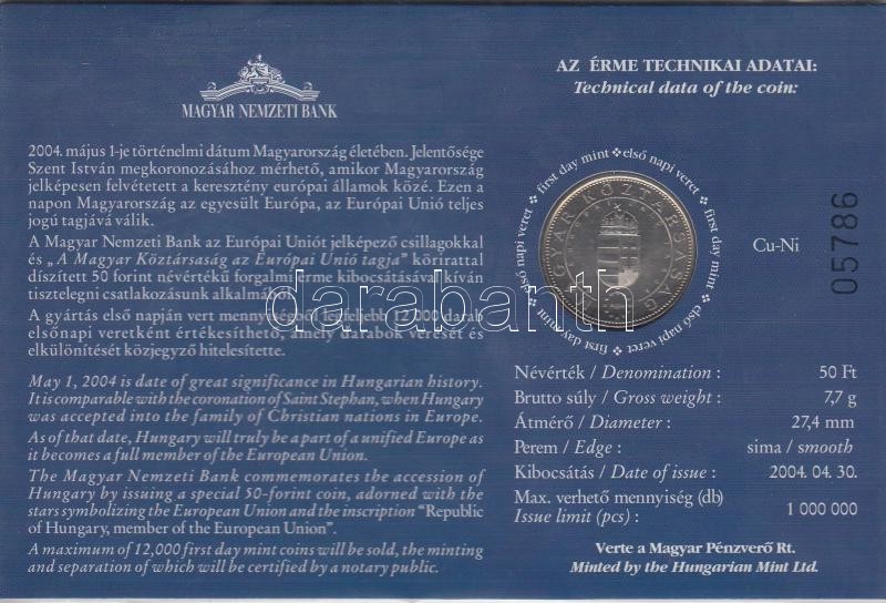 Beschreibung: 2004. 50Ft "Magyarország az EU tagja" elsőnapi veret sorszámozott emléklapon T:BU
