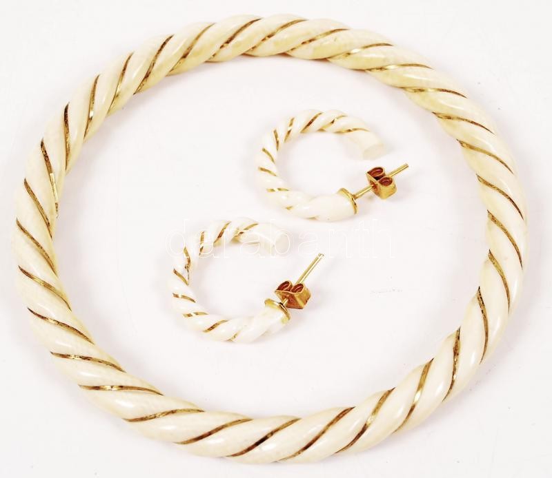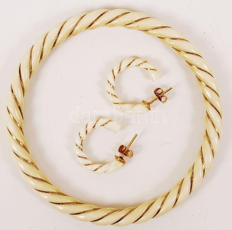 Beschreibung: Faragott elefántcsont karkötő és fülbevaló pár, fonott díszítéssel, hibátlan állapotban, 6 cm-es belső átmérővel