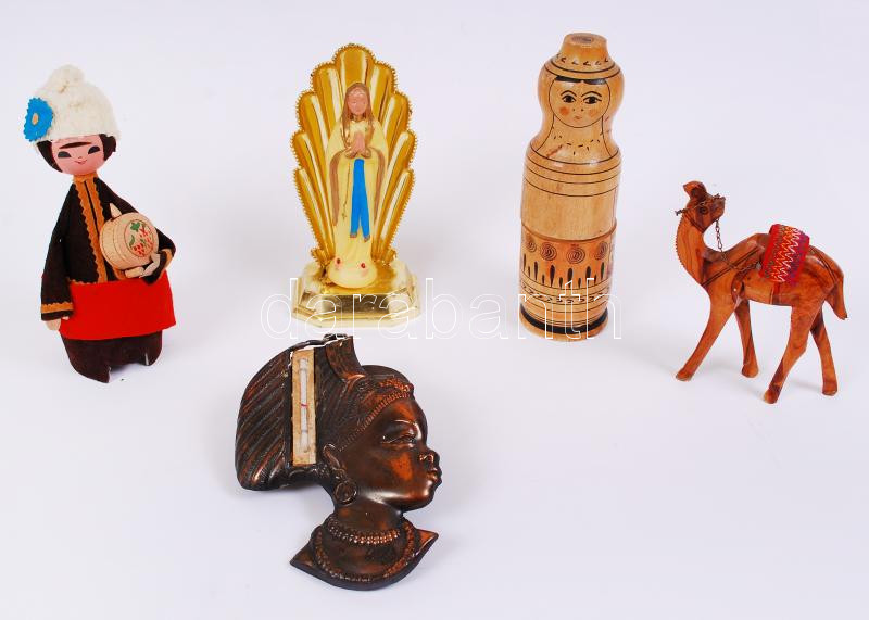 Beschreibung: 5db figura: matroska, teve, fröccsöntött Szűz Mária stb. /