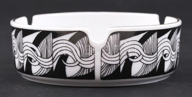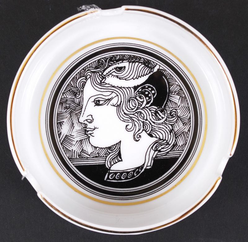 Szász Endre által tervezett Hollóházi jelzett porcelán hamuzó tálka, kézzel festett, jelzett, d:10 cm /Faces designed by Endre Szasz Hollohaza chinaware plate