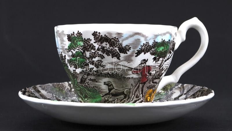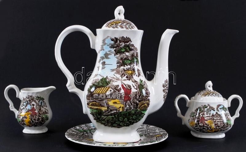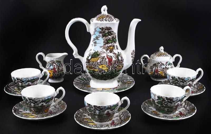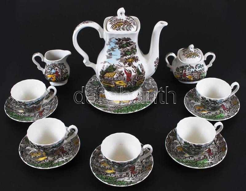 The Hunter, vadászjelenetekkel díszített, máz alatt részben kézzel festett, jelzett Myott porcelán teáskészlet: kiöntő, cukortartó, tejkiöntő, 5db csésze, 6db alátét és egy süteményes tálka /