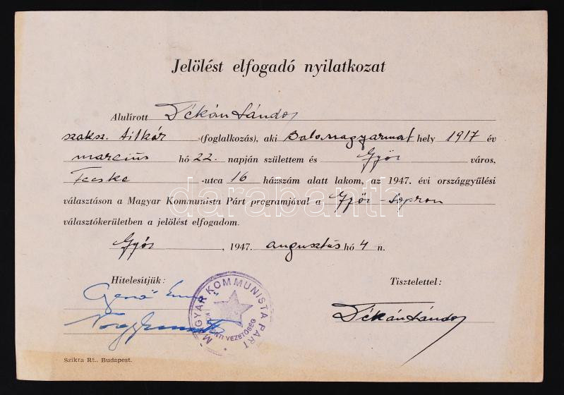 1947 A Magyar Kommunista párt jelölést elfogadó nyilatkozata Gerő Ernő... https://www.darabanth.com/de/196-Fernauktion/196.0/Andere-Sammelgebiete/Signatur~400017/1947-A-Magyar-Kommunista-part-jelolest-elfogado-nyilatkozata-Gero-Erno-es-Nagy-Ferenc-sajat-~II756235