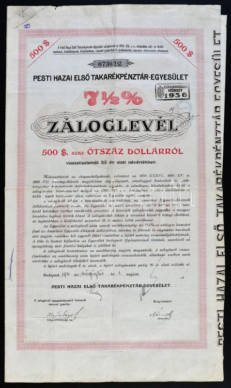 1930. "Pesti Hazai Első Takarékpénztár-Egyesület" 7 1/2% Záloglevél 50... https://www.darabanth.com/de/196-Fernauktion/196.0/Numismatik/Aktien-und-Tickets~600005/1930-Pesti-Hazai-Elso-Takarekpenztar-Egyesulet-7-1225-Zaloglevel-500USD-rol-szelvenyekkel-~II756836