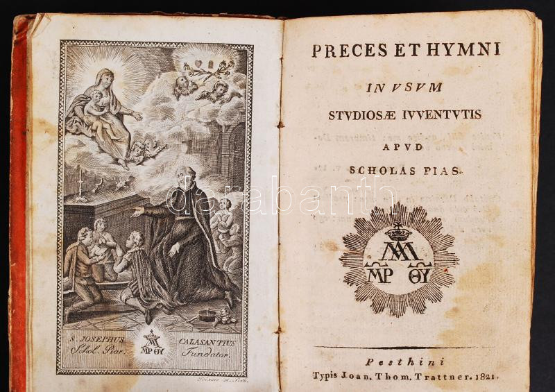 Preces et Hymni in usum studiosae iuventutis apud Scholas Pias. Pestini, 1821, typ. Joan. Thom. Trattner. Korabeli papírkötésben, rézmetszetű címképpel, az előzéklapon tulajdonosi bejegyzés, a végén bekötve kézzel írt jegyzetek 7 lapon (néhány lap foltos, a kötés kopottas, egyébként jó állapotú) /