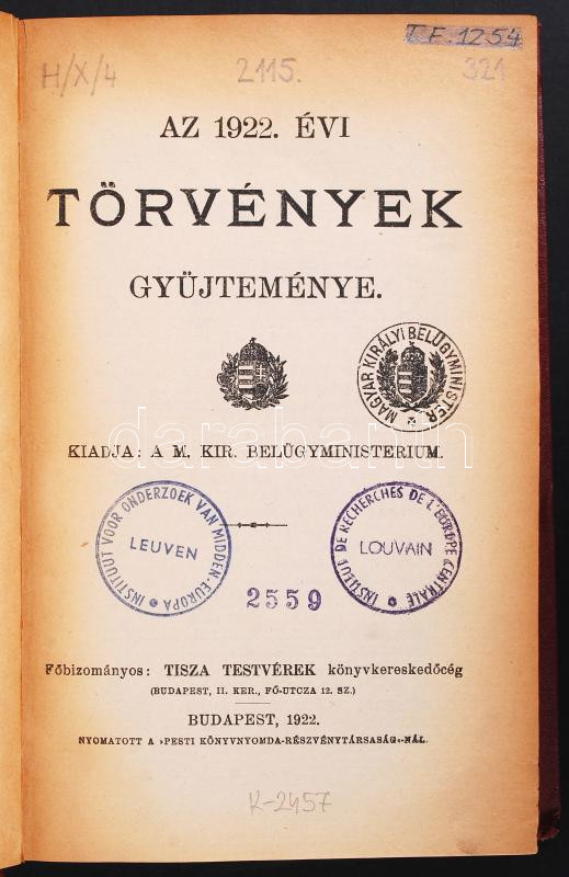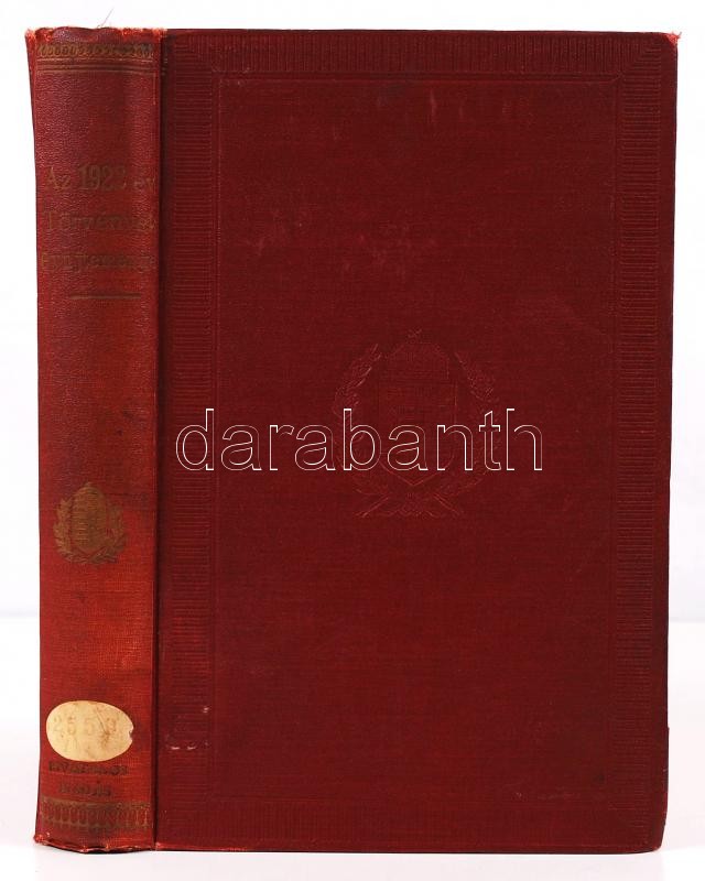 1922. évi törvények gyűjteménye Bp., 1922 Bp.-i könyvnyomda 515p. egés... https://www.darabanth.com/de/197-Fernauktion/197.0/Andere-Sammelgebiete/Bucher-Geschichte~600028/1922-evi-torvenyek-gyujtemenye-Bp-1922-Bp-i-konyvnyomda-515p-egeszvaszon-kotesben~II760846