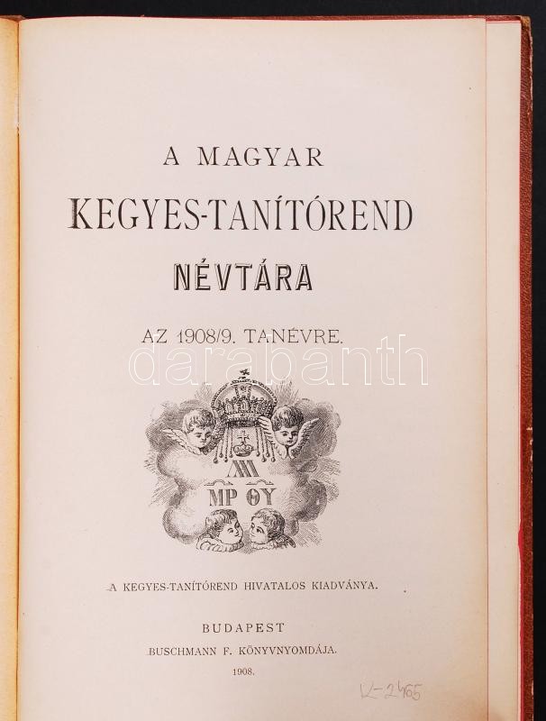 A magyarországi kegyes-tanítórend névtára az 1908/09 tanévre. Aranyozo... https://www.darabanth.com/de/197-Fernauktion/197.0/Andere-Sammelgebiete/Bucher-Geschichte~600028/A-magyarorszagi-kegyes-tanitorend-nevtara-az-190809-tanevre-Aranyozott-egeszvaszon-kotes~II760711