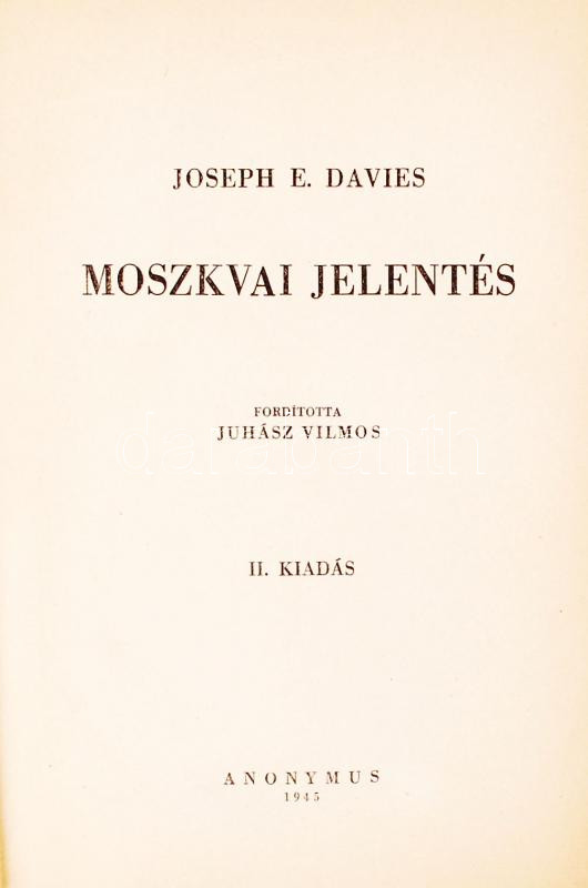 J. E Davies: Moszkvai jelentés. Bp., 1945 Anonymus. Egészvászon kötésb... https://www.darabanth.com/de/197-Fernauktion/197.0/Andere-Sammelgebiete/Bucher-Geschichte~600028/J-E-Davies-Moszkvai-jelentes-Bp-1945-Anonymus-Egeszvaszon-kotesben~II759041