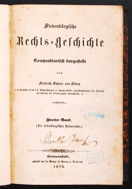 Schuler von Libloy, Friedrich: Siebenbürgische Rechts-Geschichte. Compendiarisch dargestellt. II. Bd. (Die siebenbürgischen Privatrechte) Hermannstadt (Nagyszeben), 1858, Georg v. Closius. Korabeli félvászon kötésben, jó állapotú /