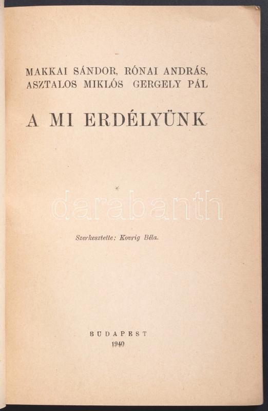 Makkai Sándor - Rónai András - Asztalos Miklós - Gergely Pál: A mi Erdélyünk. Szerk. Kovrig Béla. Bp., 1940, Nemzeti Könyvtár. Kiadói festett papírborítóban