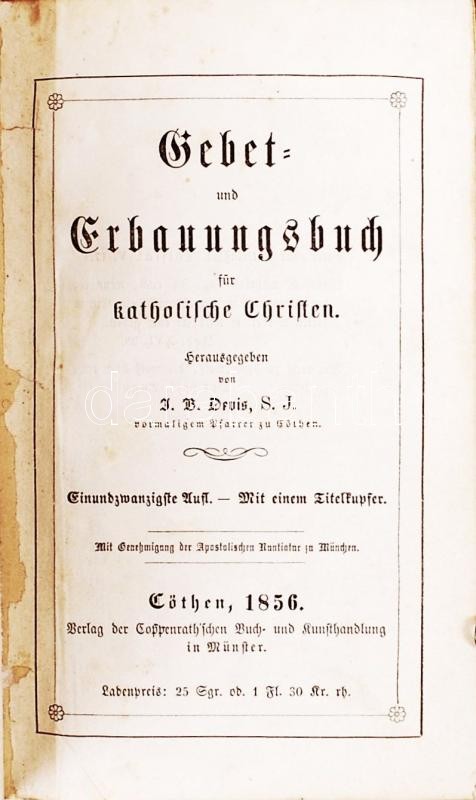 Német nyelvű csatósimakönyv: Gebet und Erbauungsbuch für katolische Ch... https://www.darabanth.com/de/197-Fernauktion/197.0/Andere-Sammelgebiete/Bucher-Religion~600035/Nemet-nyelvu-csatosimakonyv-Gebet-und-Erbauungsbuch-fur-katolische-Christen-Cothen-1856-Her~II758659