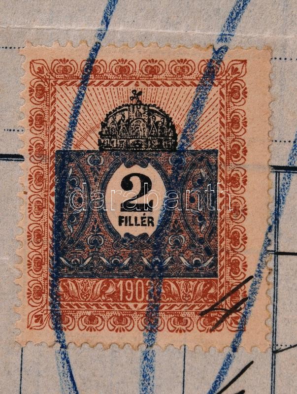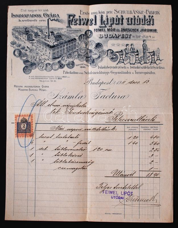 1911 Feiwel Lipót utódai bútorgyár által a pilisszentlászlói elemi népiskola gondnokságának kiállított fejléces számla 2 filléres illetékbélyeggel, pecséttel.